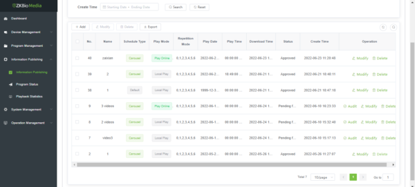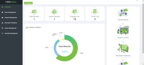 ZKBiosecurity Online Hospitality ZK Bio Media adalah platform signage digital yang terintegrasi dengan pemutaran video, gambar, audio, dan informasi multimedia lainnya, yang memberikan solusi rilis informasi berdasarkan “Presentasi Visual”.