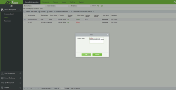 ZK BioSecurity adalah platform Berbasis Web Lengkap yang dikembangkan oleh ZKTeco. Dengan beberapa modul dalam satu sistem, platform ini menawarkan kenyamanan integrasi terbaik. Sistem ini memungkinkan pengguna untuk dengan mudah mengelola, mengontrol dan memantau perangkat dari jarak jauh, membuat beberapa laporan sekaligus, dan memberikan izin, antara lain. Ini juga kompatibel dengan banyak perangkat inspeksi sinar-X dan detektor logam walk-through (WTMD) ZKTeco dan pihak ke-3. ZKBio SIS adalah perangkat lunak manajemen keamanan terintegrasi yang dikembangkan berdasarkan ZKBioSecurity. Perangkat lunak ini mengintegrasikan pintu keamanan, pemindai bagasi sinar-x, detektor cairan, detektor bahan peledak, dan pemindai bagian bawah kendaraan. Selain itu, klien dapat mengelola dan mengontrol semua perangkat keamanan secara online di ZKBio SIS, yang nyaman dan efisien.